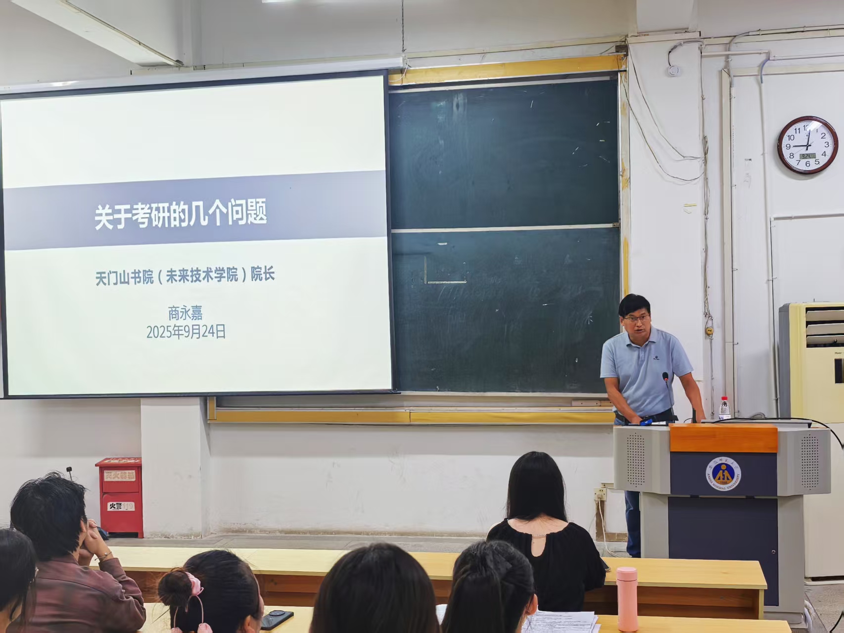 9月24日下午,天门山书院(未来技术学院)院长、化学与材料科学学院博士生导师商永嘉教授在行知楼105为2026届考研学生做了专题讲座。院党委副书记汪倩倩主持讲座。