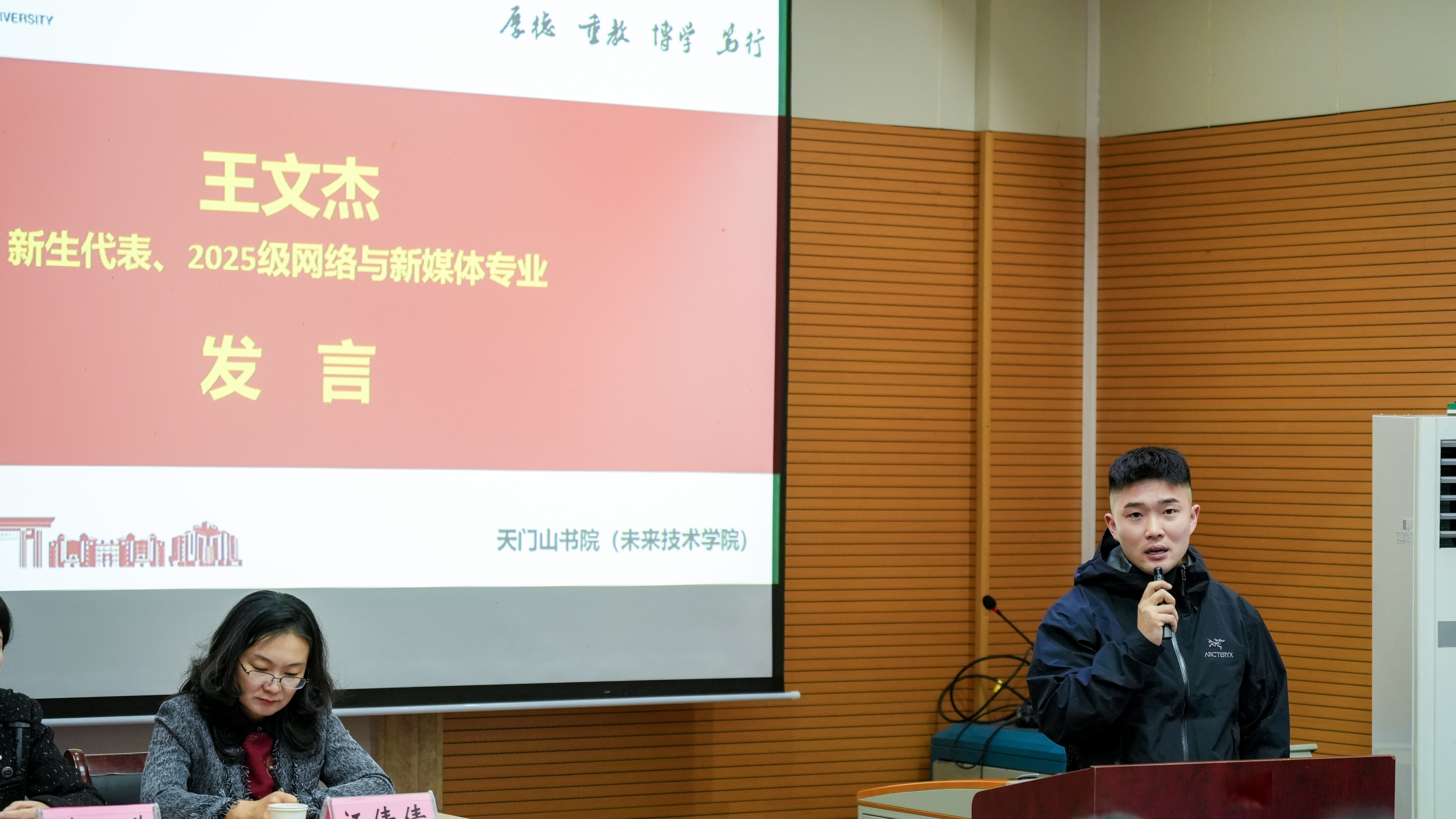 2025级网新2班王文杰代表新生发言,表示将扎实学习核心课程、锤炼探真本领,立志做懂传播、有情怀的复合型人才,以校训精神书写青春新篇。
